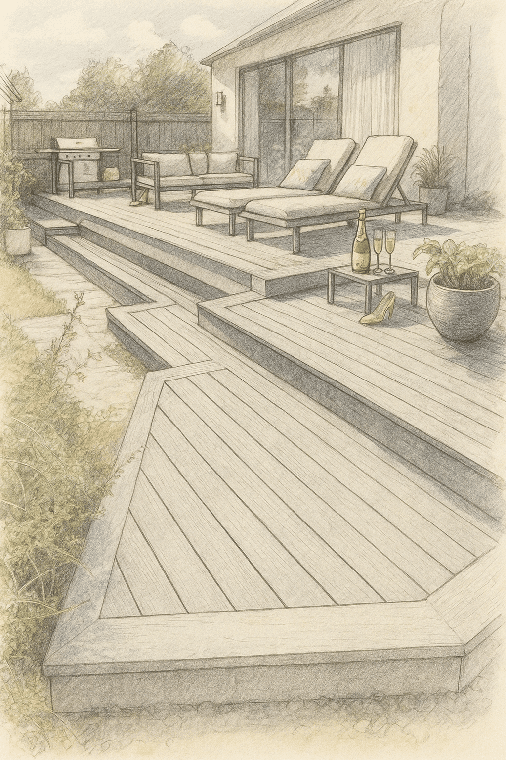 Notice how the angles are sharply defined and the framing boards line up perfectly. There’s no hesitation in this construction. Karl Harrison Landscapes builds to the same standard as the interiors his clients already enjoy. A luxury deck like this doesn’t apologise for being outdoors—it owns it.