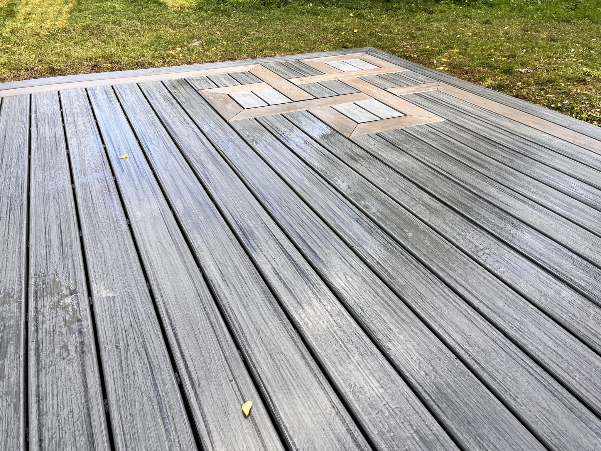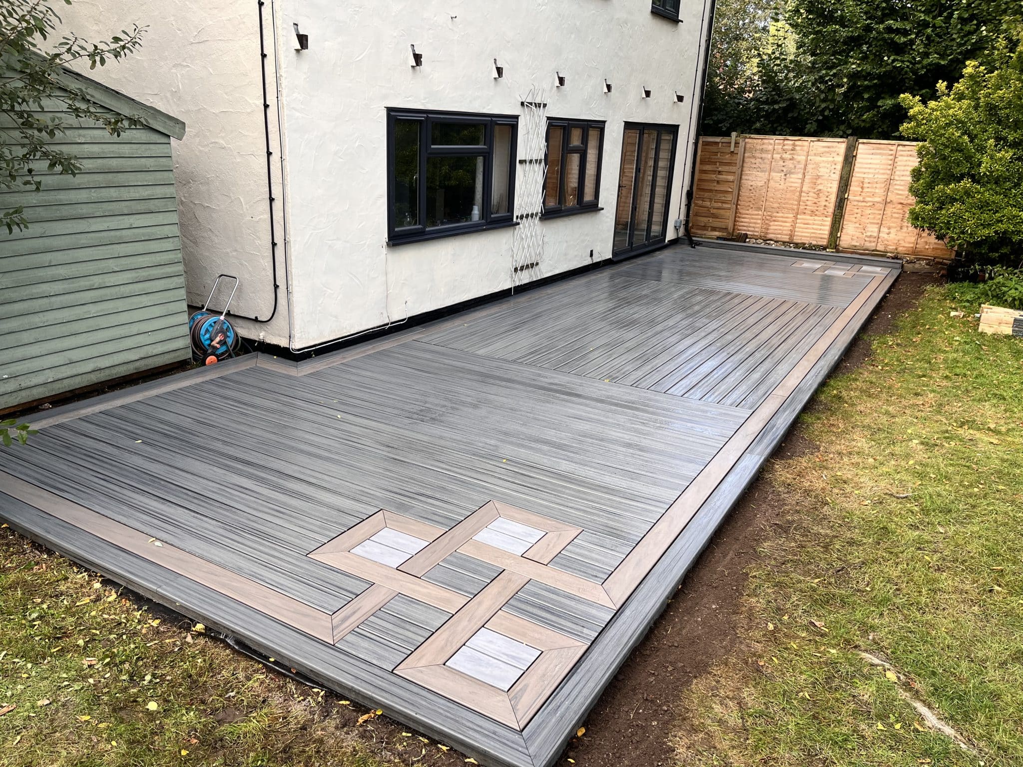 A simple decking design with a complex Celtic pattern inlay. The main field and surrounding picture frames are in Trex transcend island mist. The pattern inlay is with Trex linage Biscayne as a Celtic knot. For a final enhancement on the colour, we infilled the knot with the Trex linage Rainier board.